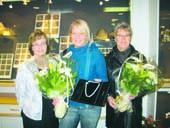 Vinderen af 1. præmien hedder Helle Elkjær, og hun vandt en perlekæde med Per Borup-lås. Både 2. præmien og 3. præmien var et gavekort på 500 kroner. Yderst til højre ses 2. præmievinderen Åse Riis Poulsen. 3. præmien gik til Kirsten Nielsen.