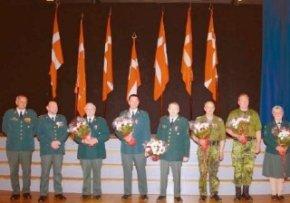 Sammen med fra venstre: chefen for Hærhjemmeværnsdistrikt Djursland, major Steen Zacho og chefen for Totalforsvarsregion Midtjylland, oberst Kurt Koch, ses her de seks modtagere af Hjemmeværnets fortjensttegn i Distrikt Djursland, Poul Erik Christensen, Finn Køpke, Hans Søren Mortensen, Ove Caspersen, Erik Toelberg og Kirsten Valbjørn.
