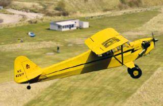På billedet ses formandens Piper Cub over Grenaa Modelflyveklubs baner. Modellen har et vingefang på godt to meter og drives frem af en lille firetaktsmotor.