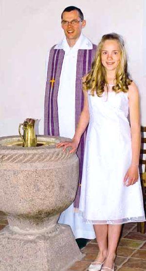 Maja Feldborg Therkildsen, Vivild, blev konfirmeret bededag den 4. maj i Fjellerup Valgmenighed. På billedet ses også valgmenighedspræst Robert Bladt.
