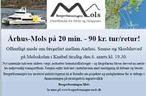 "Borgerforeningen Mols" og "Distriktsrådet for Mols og Helgenæs" inviterer til offentligt møde om ruten mellem Århus Samsø og Skødshoved på Molsskolen i Knebel. Det drejer sig om en overfart mellem Mols og Århus på kun 20 min. Alle er velkomne! - Se mere på www.borgerforeningen-mols.dk