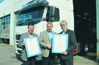 Volvo Truck Center Danmark A/S' 11 filialer er blevet miljøcertificeret ifølge ISO 14001 standarden. Samtidig er afdelingerne blevet ISO 9001 certificeret med hensyn til kvalitetsstyring. Her overrækker ledende auditor Erik M. Christiansen (th) fra Det Norske Veritas certifikaterne til Volvo Truck Center Danmark A/S' administrerende direktør Arne Knaben, mens kvalitets- og miljøchef Gert Madsen med tilfredshed ser til.