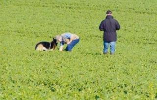 Situationen er som følger: Sporlæggeren har tabt en genstand i det høje raps. Schæferhund har fundet genstanden og står stille. Hundeføren går hen til schæferhunden og samler genstanden op, mens dommeren står og kigger på.