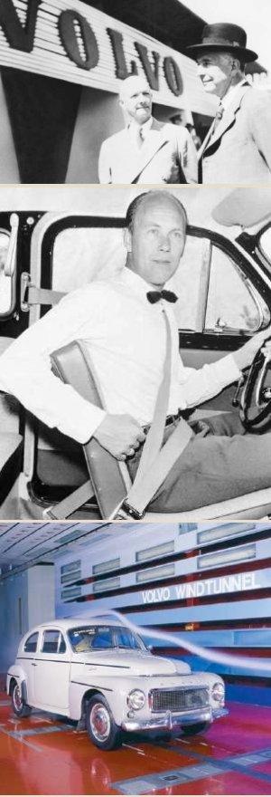 øverste billede:Volvo's to grundlæggere: Assar Grabrielsson, adm. direktør, og Gustaf Larson, udviklingsdirektør. midterste billede: Nils Bohlin, opfinderen af Volvo trepunkts sikkerhedssele, der blev introduceret i 1959. Volvo 544 testes i Volvo's nye vindtunnel i 1960.