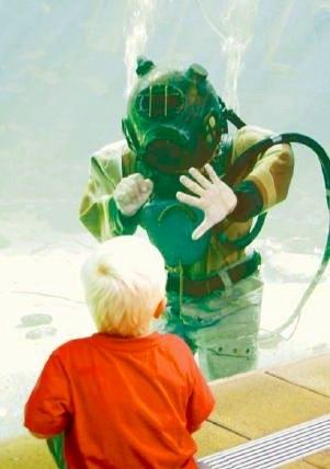 Publikum havde her mulighed for at se iklædning af dykkere og dykning med så forskelligt udstyr som: Tungdykkere som forsynedes med luft fra hånddrevne pumper, og som på trods af udstyrets vægt på knap 100 kg bevægede sig let rundt på bunden af Oceanariet iført bl.a. kobberhjelm og blysko.