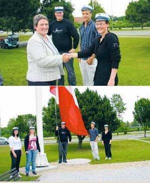 [billede nederst] De første handelsstudenter i 2007 fik hjælp af pedel Mogens Jensen til at hejse flaget i man-