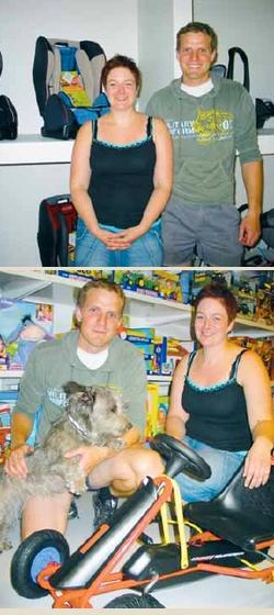 [billede øverst]Ægteparret Tanja og Morten Kjeldahl har åbnet butikken »Små mirakler« - med alt til de små mirakler (blandt andet autostole) på Trekanten 48 i Grenaa. [billede nederst] »Små mirakler« råder også over et stort udvalg af legetøj til de små mirakler. Her ses Morten og Tanja Kjeldahl - sammen med deres hund Cirkeline - omkring en lille del af det.