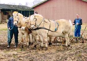 Hos Anders Dreyer på Obdrupvej ved Trustrup kan man risikere at støde på dette lidt usædvanlige syn. Harvning af mark ved hjælp af den type hestekræfter, der foretrækker rugbrød og gulerødder fremfor benzin.