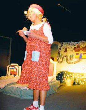 Den arrangerende dagplejegruppe sørgede blandt andet for at opføre teaterstykket »Guldlok og de tre bjørne«. Her ses hovedpersonen »Guldlok« i aktion på scenen i Pavillonsalen i Kulturhuset Pavillonen.