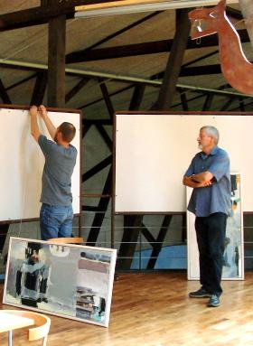Peter Møller, fra Galleri Bach-Møller, er i gang med at arrangere malerierne til udstillingen i Stenvad Mosebrugscenter med hjælp af Asger Neimann, Nørre Djurs Kunstforening