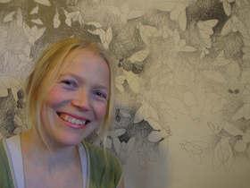 Ved brug af hundredevis af små streger, som nogle steder fortættes og andre steder helt forsvinder, får hun det figurative til at vokse frem på papiret. Tæt på er billedet et kaotisk virvar af streger, men når man ser det i sin helhed, skaber det mørke mod det lyse illusionen af figuren i beskuerens sind.