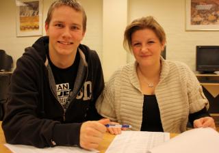 Nikolaj Brasch og Stine Vogel Pedersen er tilfredse med fodboldturneringens forløb og er her i gang med at gennemgå medlemslisterne som led i planlægning af forårets mange nye aktiviteter i VIDS. FOTO: Haakon R. Petersen.
