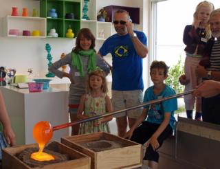 I værkstedet kan du hver onsdag (+ tirsdag i uge 29, 30 og 31) støbe dit eget lille ferieminde i glas. Medbring selv en form eller lav f.eks. et aftryk af din egen hånd i det våde sand. Der hældes flydende glas i formen, og næste dag kan den færdige figur afhentes og tages med hjem som et flot minde om glasbyen Ebeltoft.