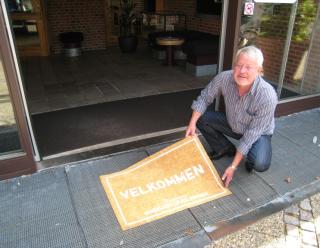 Borgmester Jan Petersen lægger velkomstmåtte ved Rådhuset i Grenaa.