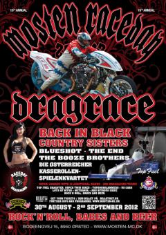 Mosten Race Day 2012 byder på Country Sisters - Back in Black - The Booze brothers - Blueshot - The End mm. Dragracing race med 250 race teams biler og motorcykler, 22 musik bands på to scener. Topfuel race - Super Twin - Top Doorslammer.