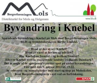 Spændende byvandring i Knebel på Mols med Borgerforeningen Mols, BLIS og fremtidsforskeren Birthe Linddal. Alle er velkomne! Hvad er der at se i Knebel ? - Hvad er værd at bevare og udvikle ? - Har Knebel en fremtid - og hvilken fremtid ? - Eller er Knebel blot en stagnerende landsby i Udkants Danmark? - Det er nogle af de spørgsmål vi sætter spot på under byvandringen. - Se erhvervs- og bomuligheder med start og stop på Molsskolen, hvor Borgerforeningen er vært ved en forfriskning.
