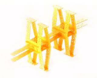 Model af bro bygget med gule KLAKX-brikker.