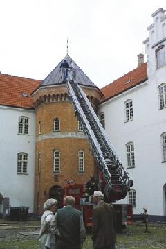 tagrenoveringen, men at der er lang vej tilbage med de indvendige reparationer inden slottet er bragt istand igen. Det er VVS-firmaet Per Møller, Grenaa, der har stået for kobberbelægningen af taget, ligesom firmaet har sørget for i-standsættelse af vejrhanen. Da stilladset var taget ned, var vejrhanen endnu ikke istandsat, og derfor ikke sat på plads, men her kom Beredskabsgården i Grenaa til hjælp, ved at udlåne sin lange brandstige til opgaven.
