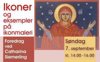 Catharina Siemerling, Ebeltoft fortæller om sin interesse for ikoner og om ikonernes historie fra besøg i Sct. Petersborg og senere Kreta. At male ikoner er en proces, som handler om at være nærværende, respektfuld og lære, at ikonerne er hellig kunst- et udtryk for synliggørelse af det usynlige. Det kræver åndelig modenhed, ellers går vi forbi dem. Ikonerne manifesterer den åndelige virkelighed, sagt af en ortodoks præst. Catharina vil også vise eksempler på, hvordan hun maler ikoner.