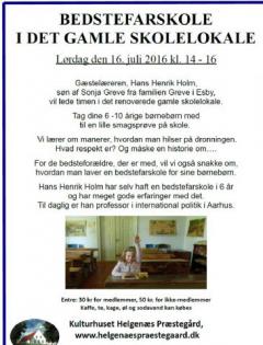 05/05 2023 Bedstefarskole i Den Gamle Skole i Kulturhuset Helgenæs Præstegård Lør. d. 16. juli 2016 , kl. 14-16