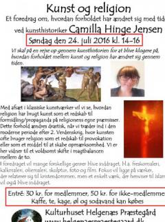 Et foredrag om hvordan forholdet har ændret sig gennem tiden ved kunsthistoriker Camilla Hinge. Vi skal på en rejse op gennem kunsthistorien for at blive klogere på, hvordan forholdet mellem kunst og religion har ændret sig gennem tiden. I foredraget vil mange forskellige genrer blive inddraget, bl.a. freskomaleri, kalkmaleri, oliemaleri, skulptur, foto og film. Fokus vil ligge på værker, der relaterer sig til kristendommen, men et enkelt værk, der henviser til Islam, vil også blive inddraget. Entré-betalingen er 50 kr. Dog kun 30 kr. for medlemmer.