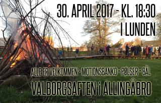 Allingåbro Borgerforening inviterer endnu engang til Valborgsaften med motionsbanko og bål samt pølser. Man starter i Lunden kl. 18.30 hvor der kan købes plader til motionsbanko. Efter turen rundt i byen tændes bålet ca. 19.30 hvor der også vil være båltale. Der tændes også op i grillen, så der er mulighed for at købe en pølse og øl/vand. Deltag i en hyggelig aften.