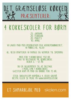 I foråret 2019 inviterer Det Grænseløse Køkken til kokkeskoler for børn. Der laves mad med inspiration fra verdenskøkkenet. Man mødes kl. 16.00 og kl. 18.30 inviteres familie og venner til spisning. - Entré til Kokkeskole for børn fra 6 til 12 år: 150 kr. mens Madbillet til fællesspisning koster 75 kr. - Køb/bestil billetter hér:
