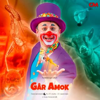 Ta´ familien med til en glad oplevelse med cirkus i børnehøjde ! - Levende underholdning med dygtige artister, dejlige dyr og den sjoveste klovn. - Kan du huske fornemmelsen af magi, der bruser i blodet ? - En følelse af begejstring, der langsomt sniger sig ind under huden på dig, og sætter sig fast som et minde... Troen på, at alt kan lade sig gøre i det øjeblik... Det er den magi, vi, som en af Danmarks cirkusfamilier, er skabt af - det er den, vi kommer til byen med... Årets forestilling har vi valgt at kalde GÅR AMOK - og hvad betyder det egentlig ? - Kort fortalt at vi endnu en gang har lagt os i selen for at levere et brag af et show. - Entré: Fra 140 kr. til 220 kr.