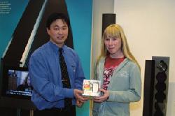 Blandt de 141 besvarelser blev den heldige vinder af mobiltelefonen Pernille Pedersen, der på billedet får overrakt sin præmie af Steffen Bakmand fra Expert i Grenaa.