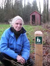 Naturvejleder Karen Schacht ved en stiafmærkningspæl på de kommende kulturstier.