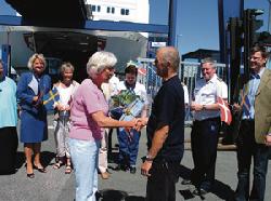Der var blomster og rejsegavekort til en værdi af 5.000 kroner til Ole Osholm Andersen, og begge dele blev overrakt af Stena Lines terminalchef i Grenaa, Inge-Lise Riis. Overrækkelsen skete foran »Stena Nautica« på Grenaa Havn kort tid før eftermiddags-afgangen onsdag den 29. juni. Og med deltagelse af feststemte og flag-svingende Stena Line-medarbejdere fra både Grenaa og Sverige.