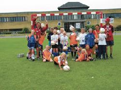 Årets DBU Fodboldskole i GIF-regi blev afviklet på Grenaa Stadion hele sidste uge. Her se én af grupperne under mandagens træning. Det ser ud til, at de havde det ret sjovt.