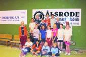 Deltagerne i tennisskolen i Grenaa Tennisklubs anlæg, flankeret af instruktørerne Trine Therkelsen og Jacob Spangenberg.