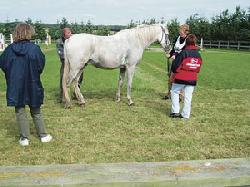 Desuden var det for klubben glædeligt at se, at flere af de placerde ryttere til dagligt findes blandt de lokale dyrlæger. Den mest kendt er Jens Kristoffersen, som for et par år siden var stævnedyrlæge under Djurslandsridtet, men nu er steget til hest sammen med sin frue, som dog fik en placering præcis udenfor præmierækken. Vejret var perfekt for hestene, hvilket måske var medvirkende til, at en meget høj procentdel af rytterne gennemførte, 60 ud af de 67 der kom til start gennemførte. Her er én af hestene til undersøgelse hos dyrlægen.