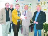 Direktør Finn Terkelsen fra Tuborg-fondet overrækker en check på 110.820 kroner til formanden for GIC-Fonden, Jørgen Steffensen. På billedet ses også bestyrelsesmedlemmerne Hans-Ole Malfeld og Poul Nielsen samt halinspektør Valdemar Haumand, der er sekretær for fondsbestyrelsen.