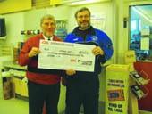 Uddeler Henning Kristensen, DagliBrugsen i Ørum, overdrager den store check til Mikael L. Nielsen fra Ørum IF