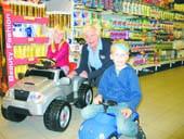 Der blev i den forbindelse udloddet en el-bil til en værdi af 1.995 kroner - med to fremadgående gear, bak-gear, speeder og bremse samt sirene - som 1. præmie, mens 2. præmien var en VW børne-scooter til en værdi af 260 kroner. Rigtig mange børn har deltaget i konkurrencen, og på billedet ses de heldige vindere sammen med Margit Sørensen fra Jaco/SuperBest i Grenaa. Vinderen af el-bilen blev 6-årige Clara Jensen fra Fjellerup, mens 5-årige Tobias Nielsen fra Grenaa vandt VW børnescooteren.