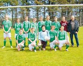 Fra overrækkelsen ses på billedet holdet med anfører Claus Dethlefsen i forreste række til højre og med afdelingsdirektør Mogens Adamsen Sparekasssen Djursland i bageste række til højre.
