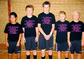 Drengene er her fotograferet før kampstart i tøj, som de har fået sponseret af henholdsvis T. M. Service fra Ryomgård og Nyt Syn i Grenaa. På billedet ses fra venstre: Kristian Gertsen, Casper Fiehn, Mikkel Møller, Nikolaj "Myre"Martinsen og Morten Bruun. Holdet trænes af Lars Fiehn.